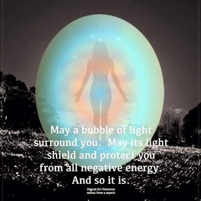 同じ技術を使ったもう一つの守護法をご紹介します。空色の光の泡が自分の周囲を囲んでいる様子を視覚化し、短いインボケーション(呼び出し)または暗示を唱えることで、あらゆるネガティブなエネルギーから自分を守る守護フィールドを顕現させることができます。このインボケーションは3回繰り返して使用できます。